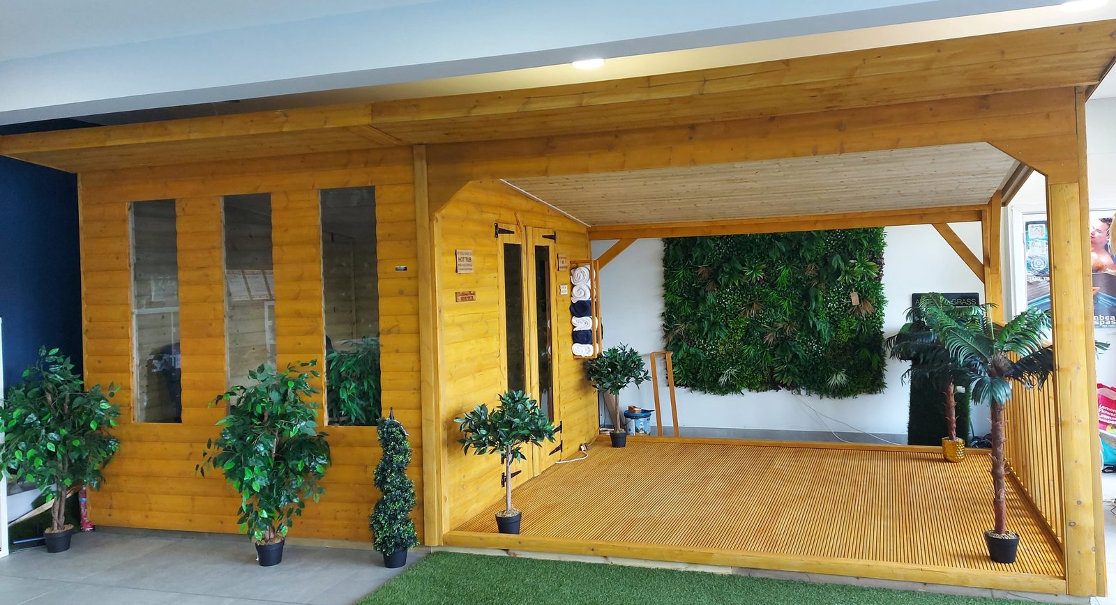The one seen here on our website is a standard 20ft X 10 ft Hot Tub Summerhouse with an 11ft x 10ft terrace and a 9ft x 10ft Changing room.