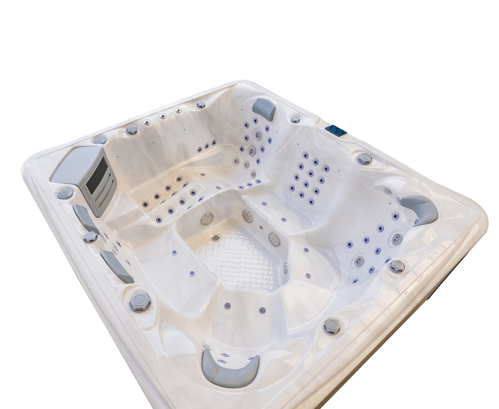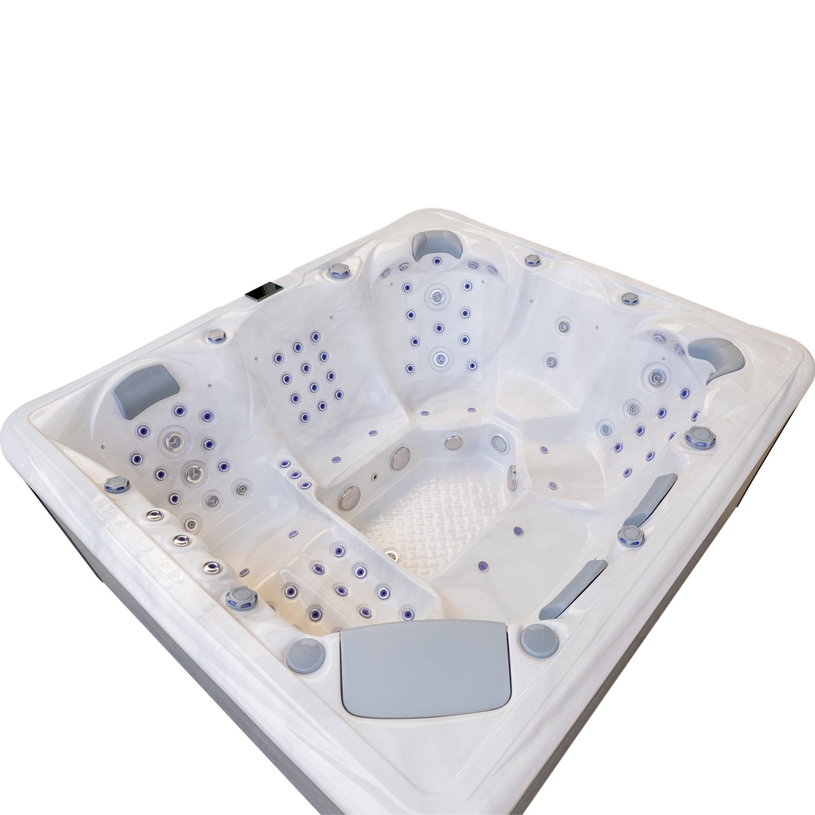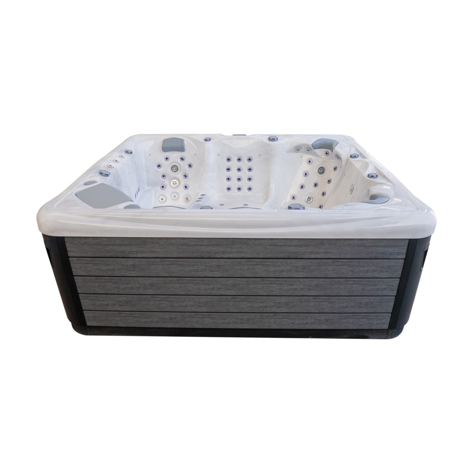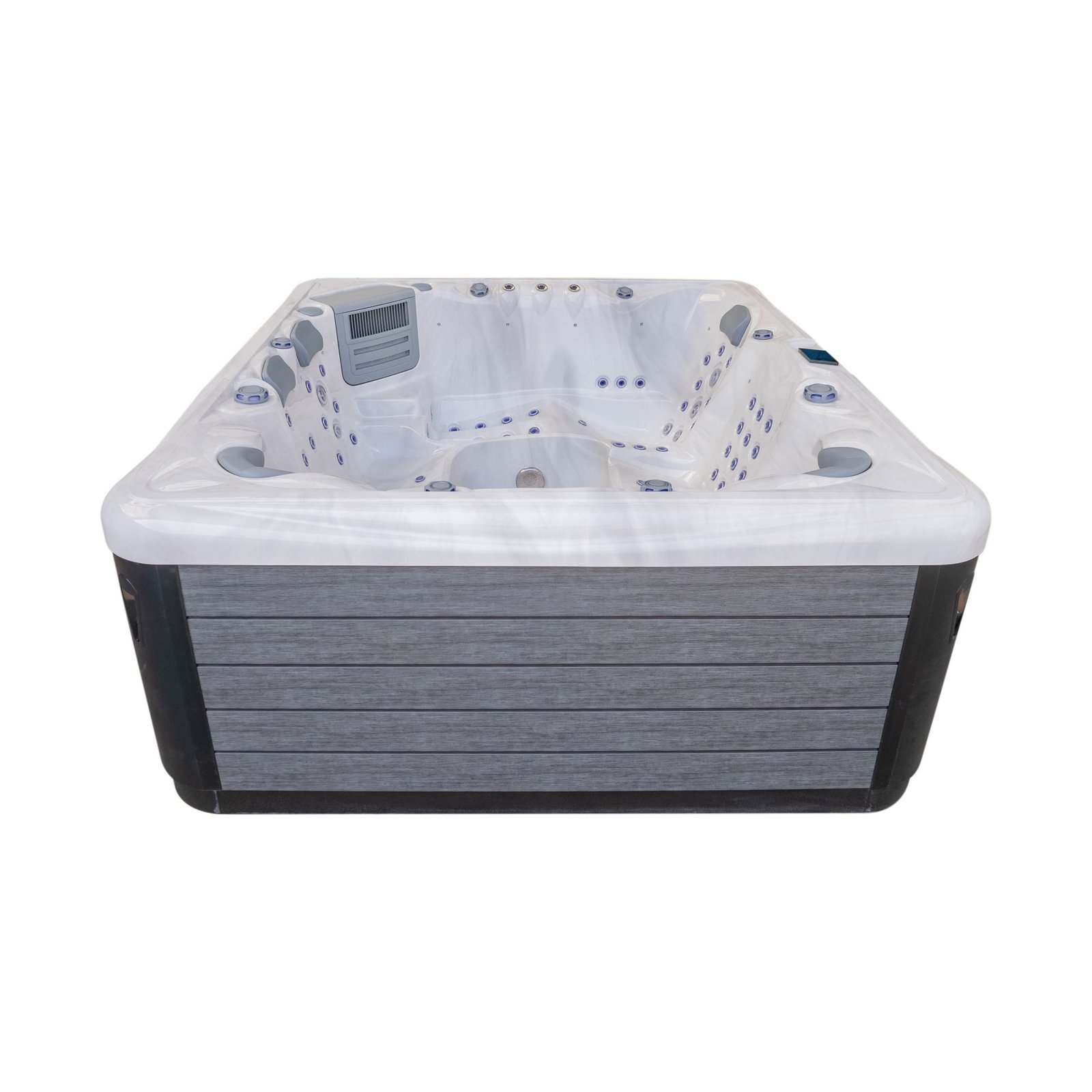 Control is handled by a premium Balboa system with SpaTouch 4 control panel, providing intuitive access to temperature, jets, lighting and system settings. Triple high-power pumps, combined with an energy-saving circulation pump and dedicated air pump, ensure consistent performance even when all seats are in use.